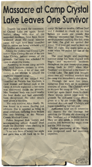 Board members voted in a unanimous decision to close down and condemn Camp Crystal Lake in Wessex County on Thursday. The one time flourishing summer camp was the site of many tragedies over the past 25 years, beginning with the drowning of a local youth in 1957. The following year, two resident counselors were found murdered on the grounds. Fires and traces of poison in the well water prevented the camp from opening on two separate occasions many years later. But the final decision to condemn the site happened earlier this summer when a brutal mass slaying shocked the entire community. Stephen Christy, son of the former owners, was one of seven individuals found murdered by a local woman in June of this year. Christy had been refurbishing the grounds in hopes to attract area youth and inner city children.